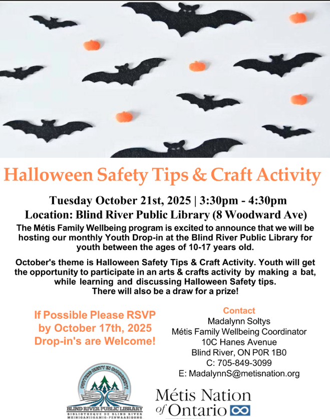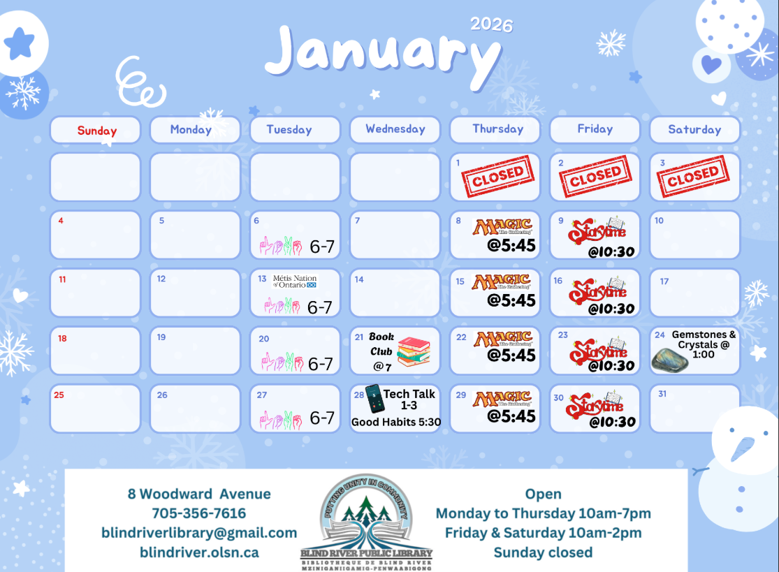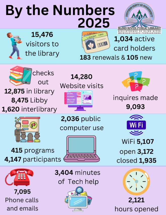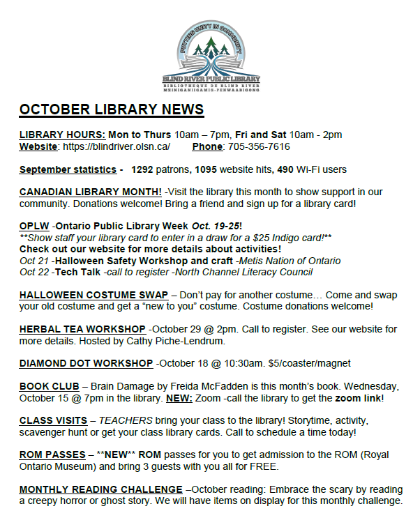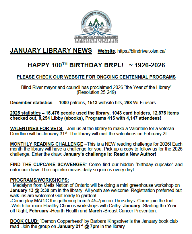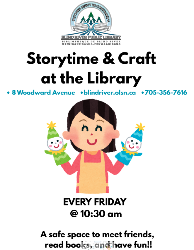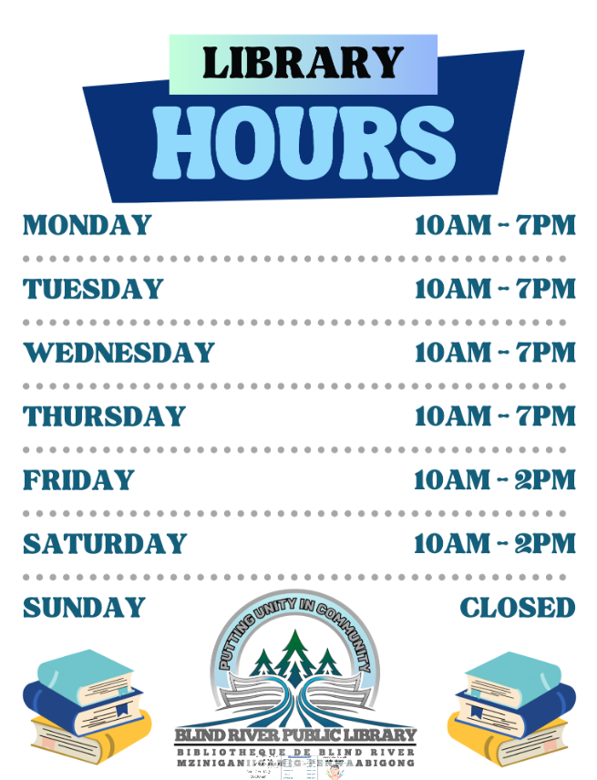 Free library service is provided at the Blind River Public Library for our residents. The library is located at 8 Woodward Avenue in Blind River.